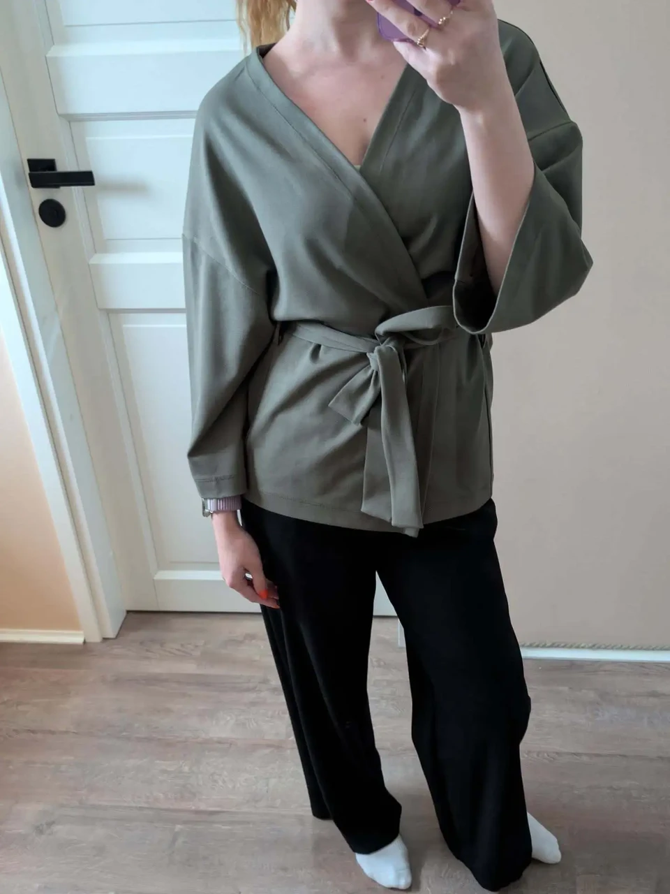 See käsitööna valminud wrap-lõikega jakk ühendab mugavuse ja ajatu elegantsi. V-kaelus ja kergelt langev õlajoon loovad naiseliku, kuid pingevaba silueti, samas kui lai seotav vöö toob kaunilt esile talje.